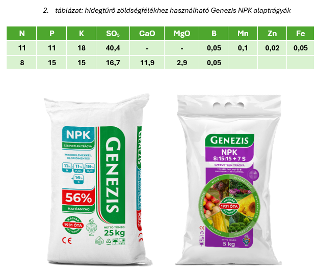 Az alábbi táblázatban az első termék (Genezis Szulfátos 11-11-18 + ME NPK) kifejezetten kloridmentes alapanyagból készül, magas kén és káliumtartalommal, valamint mikroelem kiegészítéssel. Így nyugodtan használhatjuk közvetlenül a vetés előtti talajelőkészítéskor alaptrágyaként a tavaszi időszak során is, de kloridmentes tulajdonsága akár fejtrágyaként való kijuttatását is lehetővé teszi az összes káliumigényes kertészeti kultúra esetében. A 8-15-15 + B NPK terméket, amely kalciumot és magnéziumot is tartalmaz pedig az őszi időszakban javasolt használni a tavaszi vetésre szánt területen (a klórtartalma a csapadékkal kimosódik fokozatosan a talajból amire a vetési időszak elérkezik).